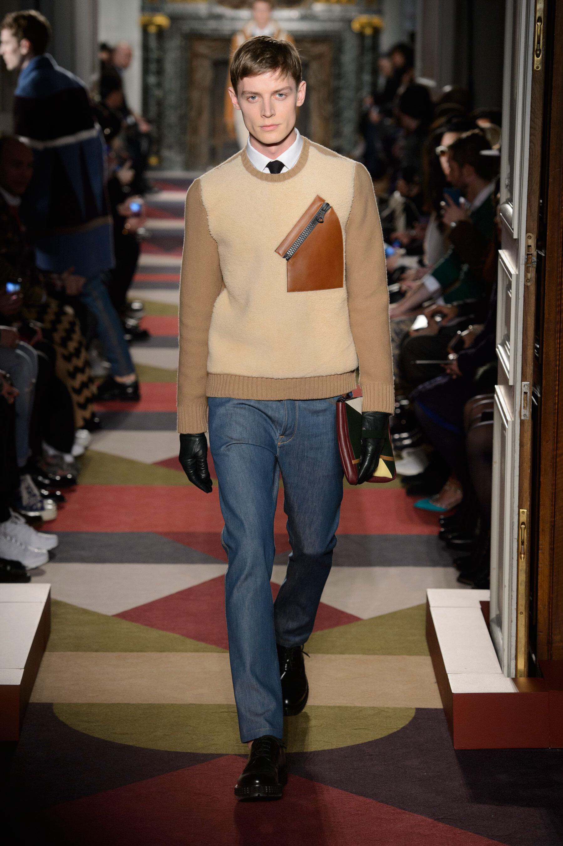 Valentino men's FW 15 collection: Classic elegance with color blocking inspired by Australian artist Esther Stweart featuring Haute Couture tailoring, micro prints and hand-painted detailing.